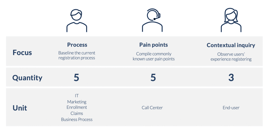 Our discovery effort combined stakeholder interviews, call center insights, and journey mapping. We spoke with people across IT, claims, enrollment, marketing, and customer support to understand both the technical and human sides of the problem.